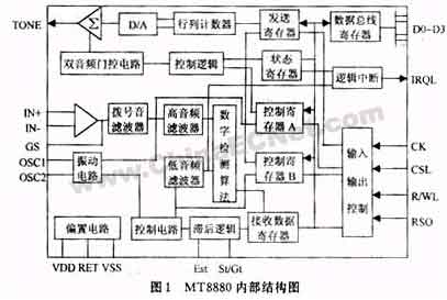 MT8880C是一个带有呼叫处理滤波器的单片DTMF信号收发器。他的制造采用MITEL公司的低功耗、高稳定性的ISO-CMOS技术。DTMF信号的接收部分采用DTMF信号接收单片机MT8870的工业制造标准;发送部分采用开关电容进行D/A转换发送高精度、低畸变的DTMF信号。内部寄存器提供一个群模式。在双音频群模式下DTMF信号可以通过精确的时序被发送出去。可选择呼叫处理滤波器让一个微处理器处理呼叫音频信号。MT8880C还具有标准的微处理器总路线与6800系列的微处理器直接连接。