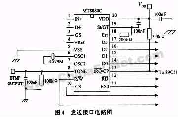 2.2 MT8880接收电路设计 当MT8880作为DTMF接收器的时候,DTMF信号经由IN+和IN-输入,经过运算放大滤除信号中的拨号音频率,然后发送到双音频滤波器,分离出低频组和高频组信号,通过数字计数的方式检出DTMF信号的频率,并且通过译码器译成4位二进制码。4位二进制编码被锁存在接收数据寄存器中,此时状态寄存器中的延时控制识别位复位,状态寄存器中的接收数据寄存器满标识位置位,对外而言,当寄存器中的延时控制识别位复位时,IRQ/CP由高电平变为低电平。如果用IRQ/CP作为单片机的中断信号,IRQL由高电平变为低电平,向CPU发出中断请求,当CPU响应中断,读出寄存器中的数据后,IRQ返回高电 平。MT8880的D0~D3与单片机的P1.0~P1.3相连,P1.4-P1.7分别与CK,RSO,CS,R/W相连,电路图如图3所示。 2.3 发送电路设计 当MT8880作为发送器时数据总线上D0~D3四位二进制码被锁存在发送数据寄存器中,发送的DTMF信号频率由3.58 MHz的晶振分频产生。分频器首先从基准频率分离出8个不同频率的正弦波,行列计数器根据发送数据寄存器中的数据,以八取二方式分离出一个高频信号和一个低频信号,经开关电容做D/A转换,在加法器中合成DTMF信号,并从TONE端输出,电路图如图4所示。